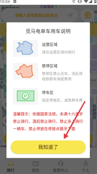 打开觅马出行,了解用车规则,点击【我知道了】。