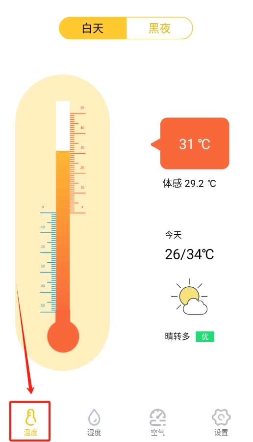 1、 打开极简温度计软件,一进首页就能看到当前的温度显示,很直观。