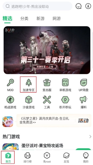 在魔趣网成功安装7723游戏盒正版后,打开软件进入首页,找到并点击“加速专区”板块。
