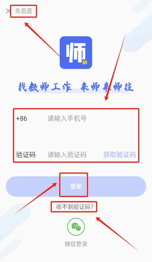 1. 开启师来师往软件,于登录界面填入自己的手机号码,随后填入接收到的验证码,以完成登录步骤。