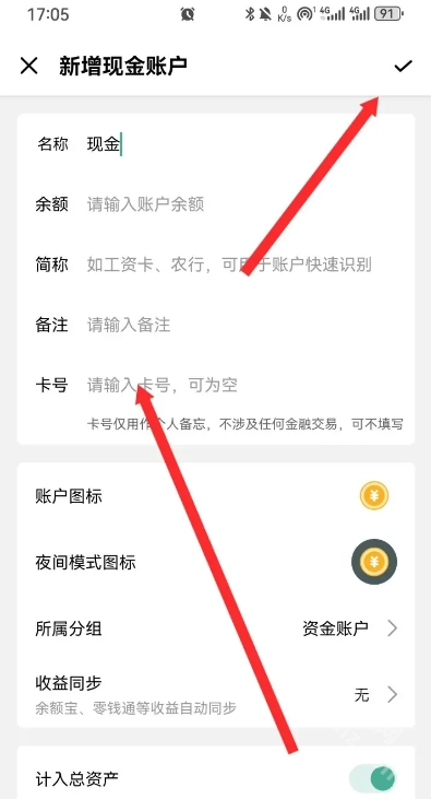 在弹出的窗口中,详细填写您的现金相关信息,确认信息准确无误后,点击顶部的“✓”保存图标即可完成操作。