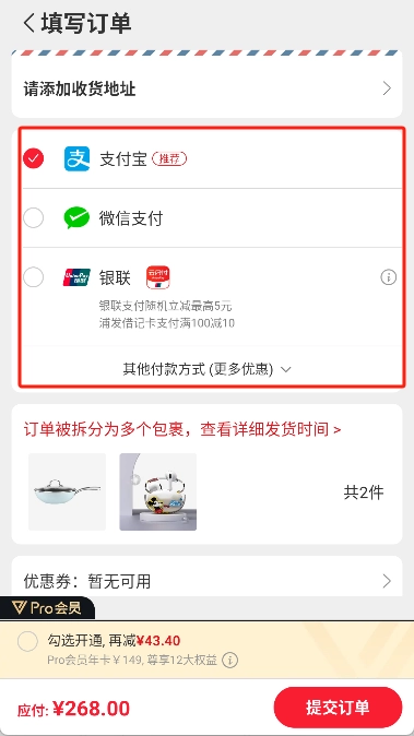 在结算页面能够挑选支付方式,像微信支付、支付宝之类,进而完成购买流程。