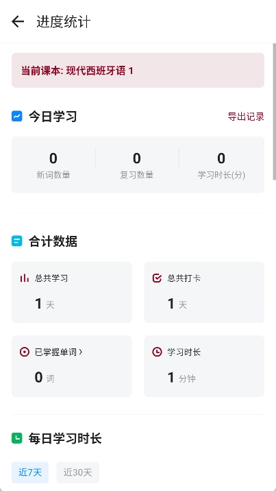 用户也能够查看自身的学习进度,涵盖已学习的单词数量、有待复习的单词数量、词汇总量等方面的信息。