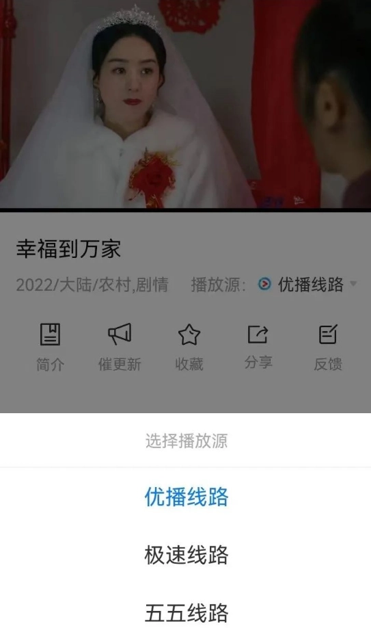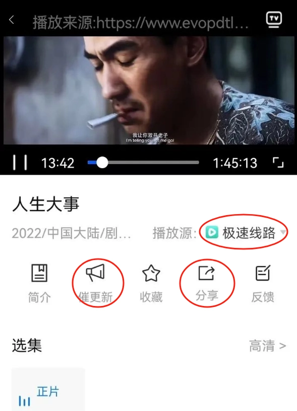 播放界面支持切换播放源,还能进行催更、分享、收藏等操作。