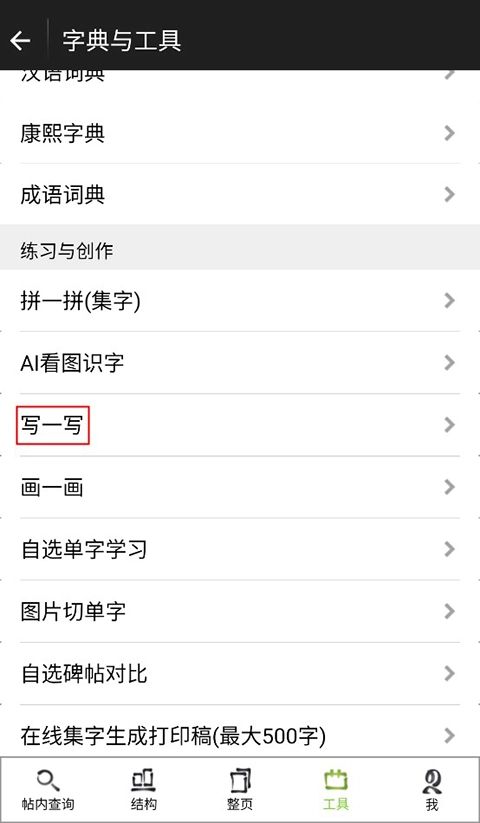 借助工具开展练习:进入学习界面后,点击右下角的“工具”按钮,从中选择位于中间位置的“写一写”功能,即可开启书法练习。