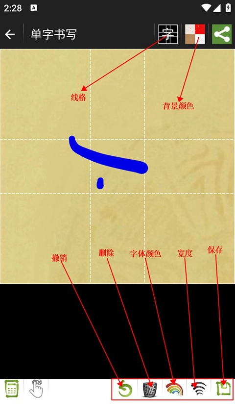 练习界面的功能设置如下:在界面的右下方区域,从左到右依次排列着撤销、删除、字体颜色、字体宽度以及保存这几个功能按钮;而在界面的右上角,设有外虚线框和背景图的相关设置选项,用户能够依据自身需求对这些设置进行调整。