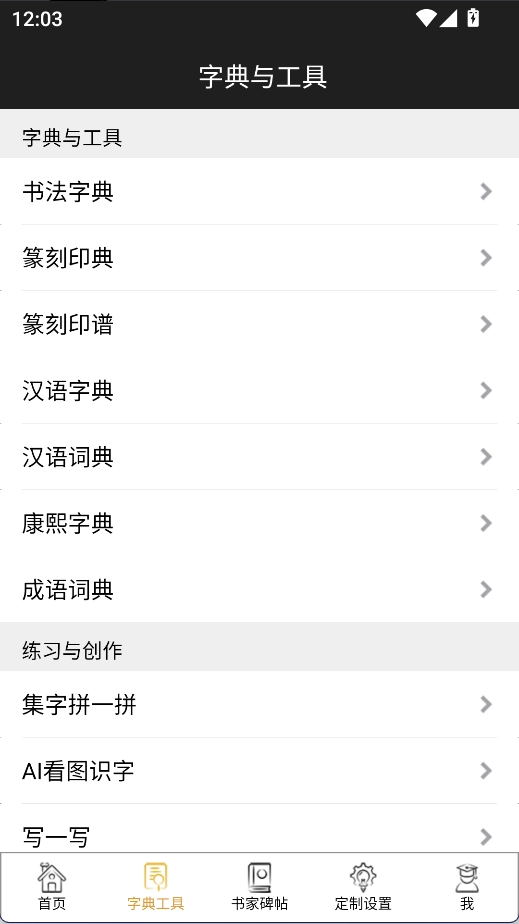 工具包含书法字典、篆刻印典、印谱、汉语字典、书论日历之类。