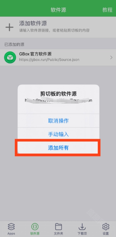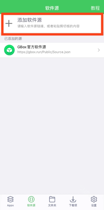 打开GBox软件,依次点击软件源、添加软件源,复制需要添加的软件源链接后完成添加操作。