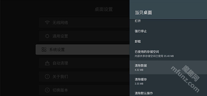 点击【当贝OS】,找到并依次点击【清除数据】—【清楚缓存】—【清楚默认操作】选项;