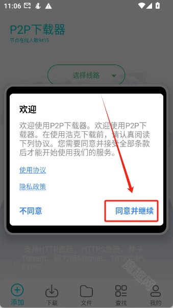 在魔趣网(https://www.mfunz.com/)找到p2p相关工具,完成打开操作进入页面后,点击“同意并继续”按钮。