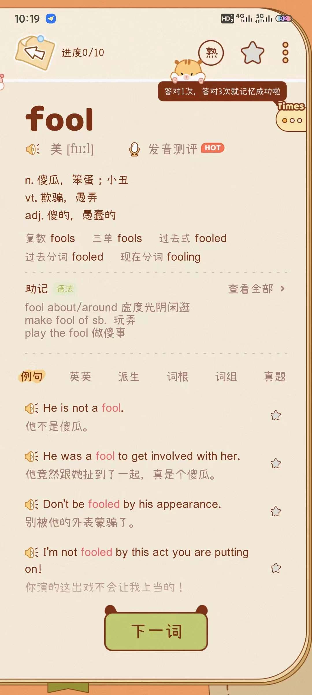 科学记忆的方法可以这样安排:把词根词缀记忆法、五格记忆法和艾宾浩斯遗忘曲线结合起来,并且要定期进行复习,再借助萌鼠的每日提醒打卡功能,这样就能更好地巩固记忆效果了。