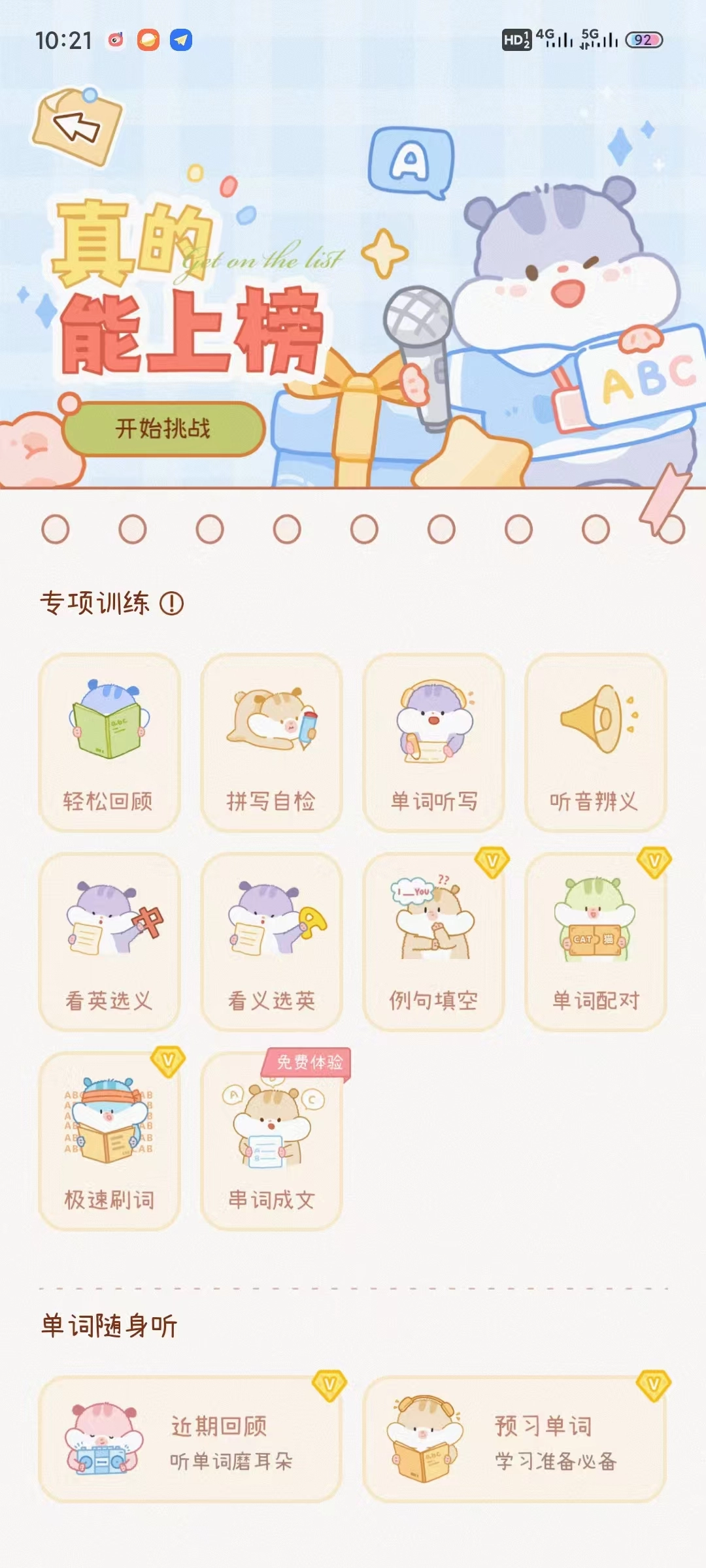 多样化学习模式:涵盖单词拼写测试,助力循序渐进攻克重词难词;搭配宠物陪伴学习功能,灵活调节学习节奏,让英语学习更轻松。