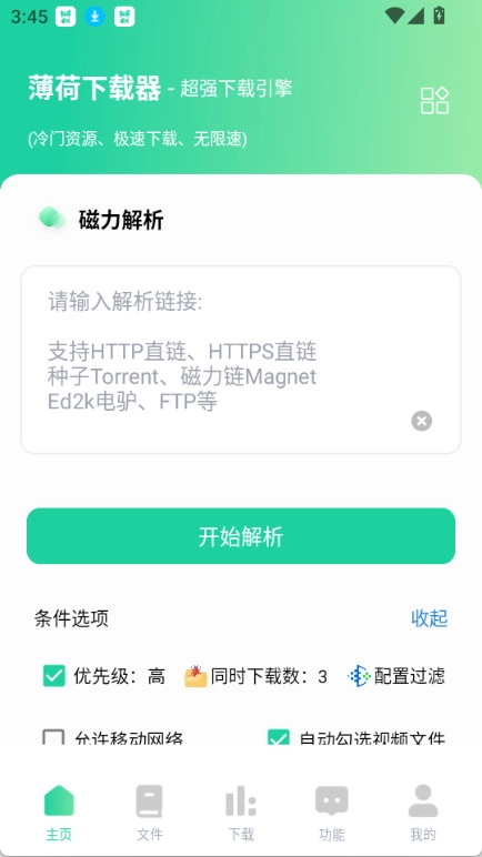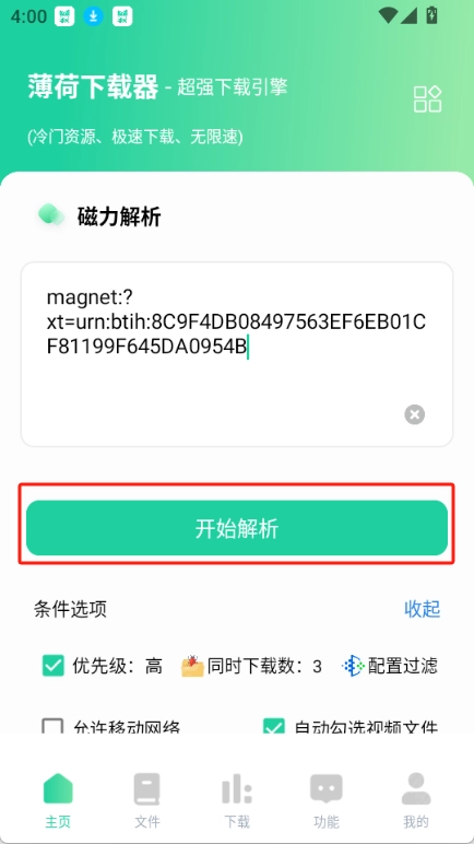在薄荷器里,你得输入或者粘贴你想要的文件的磁力链接,接着点击开始解析。
