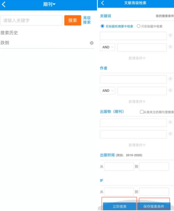 无需进行任何输入操作,直接点击搜索框旁的搜索按钮进入搜索界面,然后点击高级检索。和其他平台的操作方式相同,只需对影响因子、日期等各类信息进行限定就可以了。