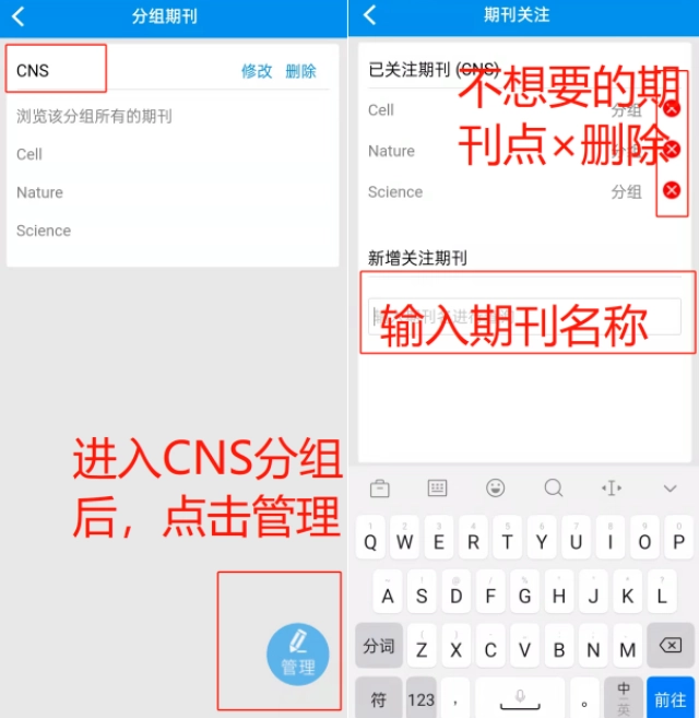 第二步:添加关注期刊或创建分组;操作方式为选择“新增关注期刊”或“新增分组”选项,输入对应信息后点击确认即可(需要注意的是,直接新增关注期刊是从全部期刊目录中添加,这种方式可能会给后续的分组阅读带来不便,因此更推荐先创建新分组,再在该分组内添加期刊)