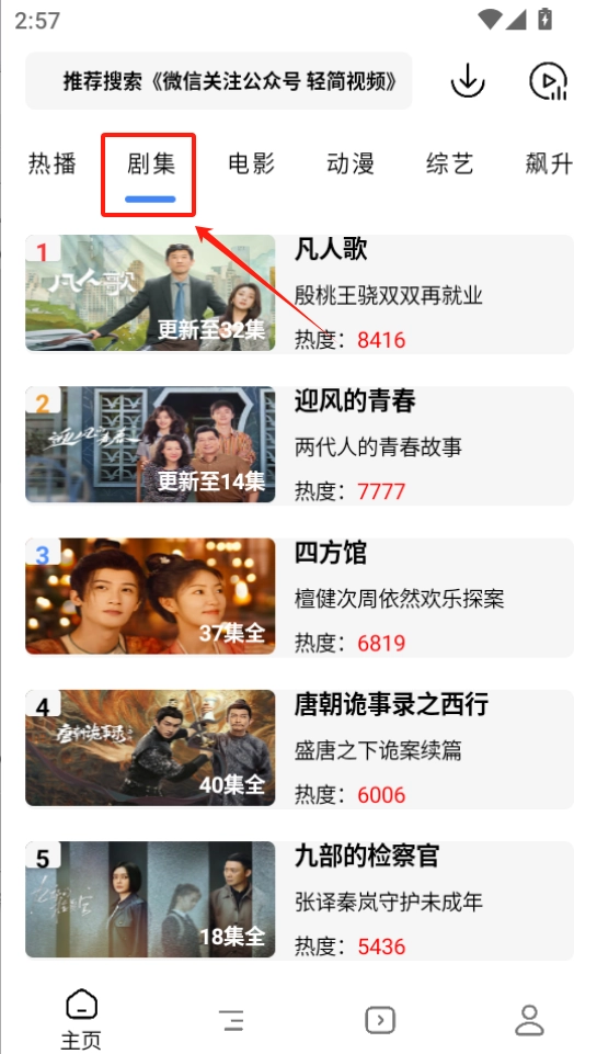 打开轻简视频,在顶部切换到剧集。