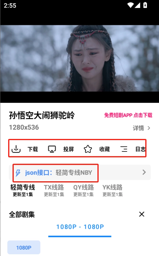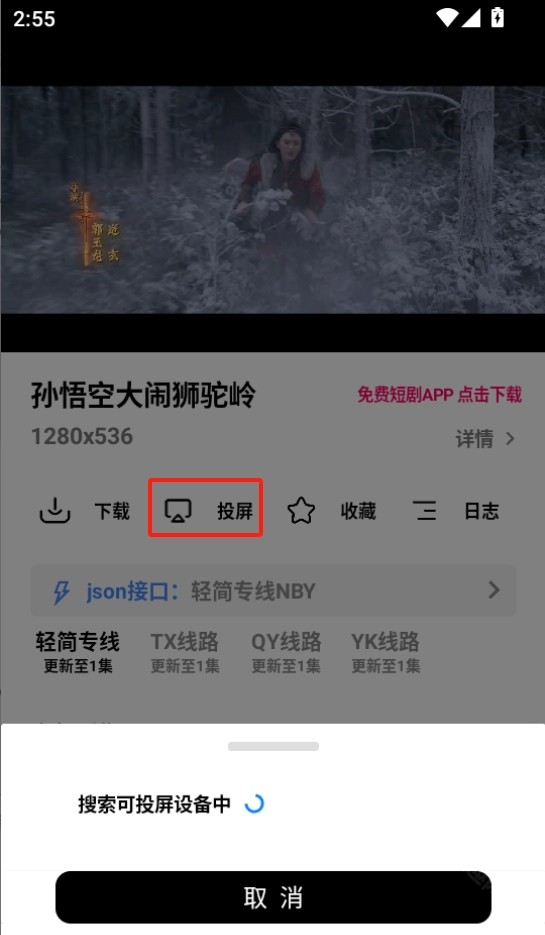 点击播放后可以、投屏、收藏,选集和切换线路和接口