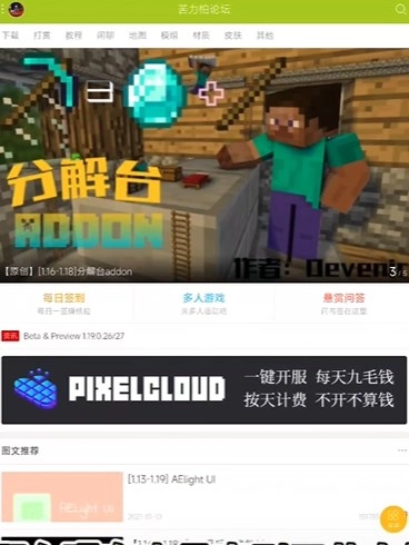苦力怕论坛是专为Minecraft打造的游戏论坛平台,玩家能在这里浏览大佬分享的攻略教程,获取游戏最新资讯,还能免费获取各类地图、模组与材质资源。