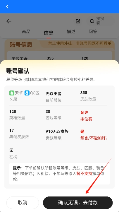 查看账号详情:找到心仪的账号后点击进入详情页面,查看账号的详细信息,包括游戏段位、装备等。
