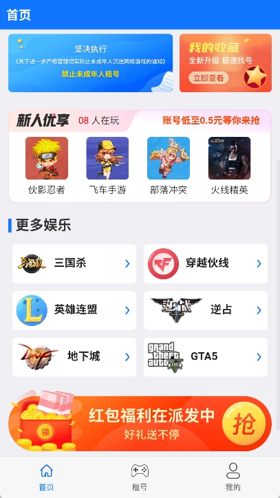 租号玩手机版,新用户注册就能获得10元红包,各类高端账号都能随意体验。
