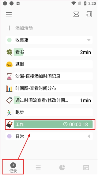 3、设定好计划后,可在【记录】页面完成事件时进行打卡,点击项目即可,之后就会在此为此项事件计时,事件完成后,再次进入,点击此事件,就可结束计时。