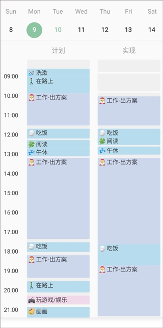 4、在当日日程完成后,可在计划页面复盘计划与实施时是否有出入,出入地方在哪里。为之后的安排做更为细致的规划。