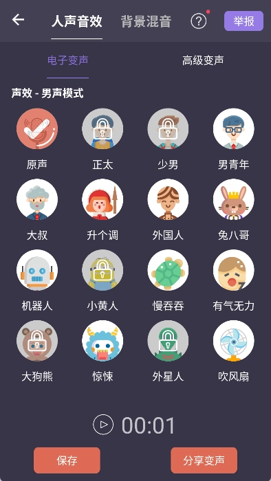 保存音频文件:选中你想要设置的变声音效后,点击底端左下角的“保存”按钮,就能把音频文件保存到你的手机里了。