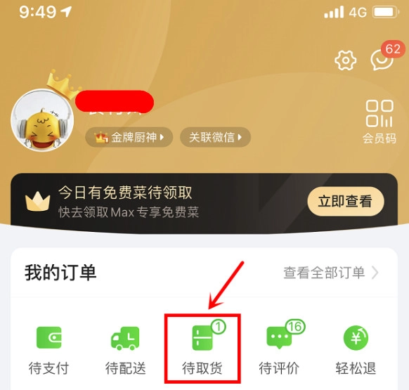 第一步:打开食行生鲜“我的”-点击“待取货”