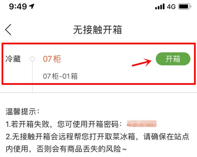 第三步:点击“开箱”绿色按钮,即可看到对应柜子有绿灯闪烁表示打开咯!