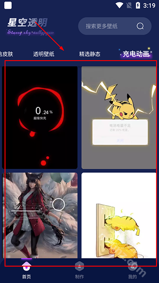 打开星空透明壁纸,进入【充电动画】界面;