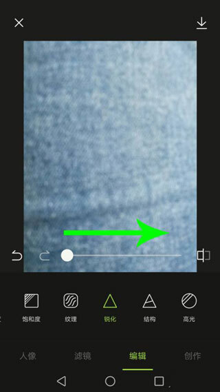 打开锐化工具后,将白色圆球向右拖动,以此增强锐化效果,从而使照片更加清晰。