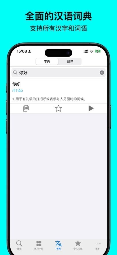除了查询功能外,我们还为App所支持的所有汉字配备了书写练习模块。在练习过程中,App会引导用户遵循规范的笔顺来书写汉字。坚持练习有助于逐步熟悉汉字的正确书写方式,同时也能加深对汉字结构框架的理解。