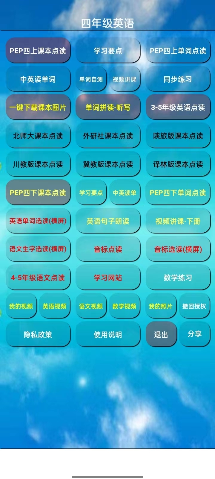 四年级英语上册配备了丰富的学习资源,涵盖课本里的核心词汇、关键句型以及日常对话训练,能够帮助学生全方位提升英语水平。