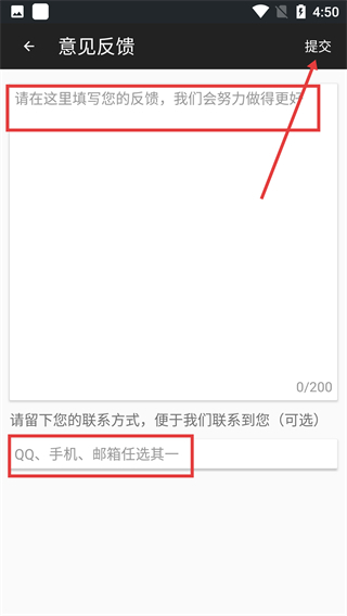 在意见反馈页面填写反馈内容以及可选的联系方式后,点击右上角的【提交】按钮,即可完成意见反馈的提交操作。