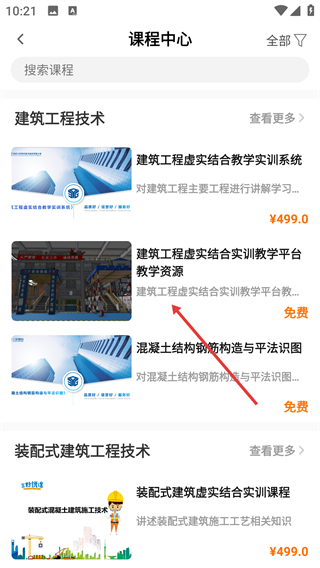 在课程中心页面挑选目标课程(例如【建筑工程虚实结合实训教学平台教学资源】),然后进入该课程的详情页面。