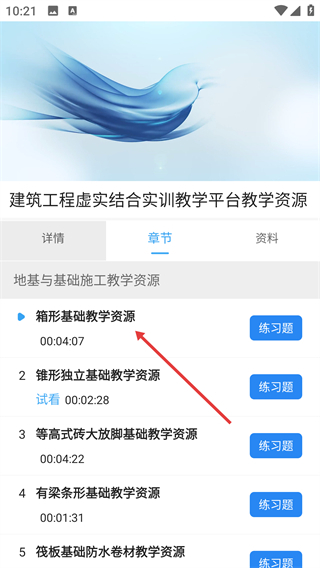 在课程详情页的【章节】标签下,挑选具体的教学资源(例如【箱形基础教学资源】),为学习相应内容做好准备。
