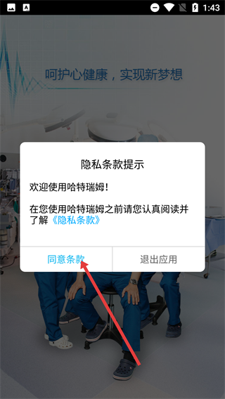 在隐私条款提示弹窗里阅读完《隐私条款》,点击【同意条款】按钮,即可进入哈特瑞姆的引导页面。