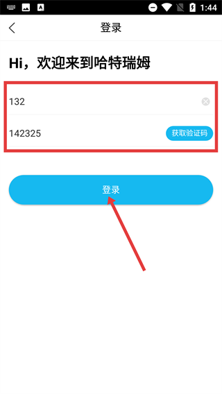 在短信验证码登录界面输入手机号和验证码后,点击【登录】按钮,即可完成哈特瑞姆账号的登录流程。