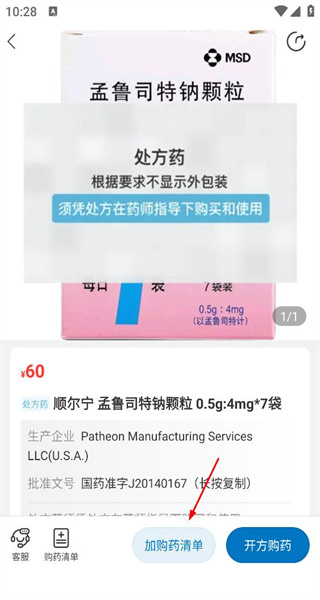 进入顺尔宁颗粒的详情页面后,会看到该药品属于处方药,同时还能看到它的价格以及生产企业信息。接着,点击“加购药清单”按钮,就可以把这款药品添加到清单当中了。