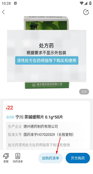 进入宁川茶碱缓释片的详情页面后,页面会展示出该药品属于处方药的信息,同时还会呈现其价格以及生产企业等内容。此时,点击“加购药清单”按钮,就能将这款药品添加到对应的清单之中。