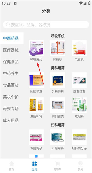 打开软件后,进入分类页面,中西药品分类下包含呼吸系统分类,呼吸系统分类下设有哮喘用药选项,点击该选项即可进入对应的药品列表页面。