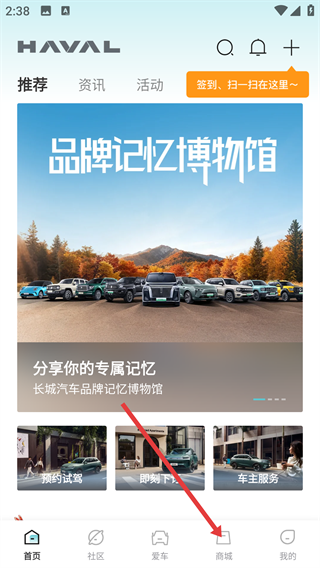 在这个页面点击底部的【商城】入口,就能进入对应的页面,该页面包含【品牌记忆博物馆】和【预约试驾】等功能模块。