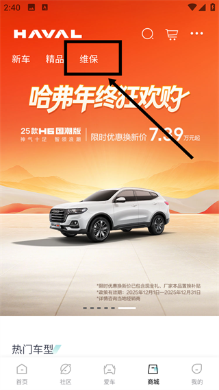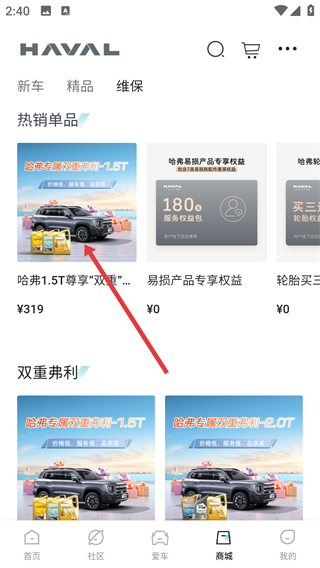 进入【商城】页面后,点击顶部的【维保】标签,就能看到【哈弗年终狂欢购】活动以及相关车型的优惠信息。