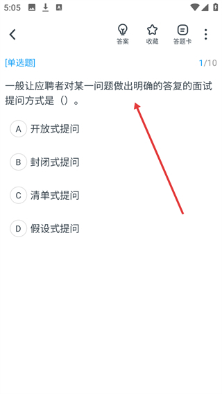 在单选题答题界面中,若遇到关于面试提问方式的题目,需选择相应选项来完成作答,过程中可以借助【答案】等功能提供辅助。