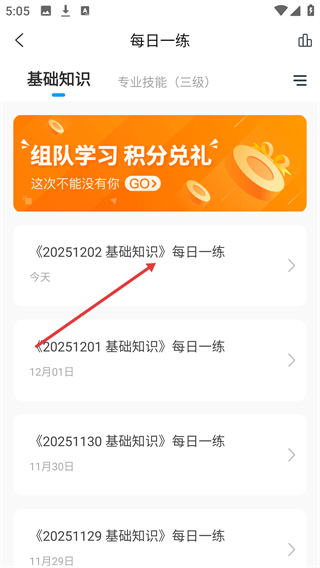 在【每日一练】页面,找到并点击当日对应的【《20251202基础知识》每日一练】选项,即可进入具体的练习内容页面。