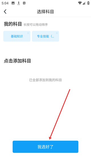 在涵盖【基础知识】【专业技能】的科目页面,核实科目已添加完毕后,点击【我选好了】即可完成科目选择操作。