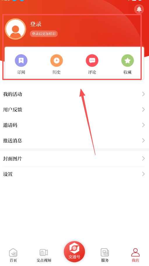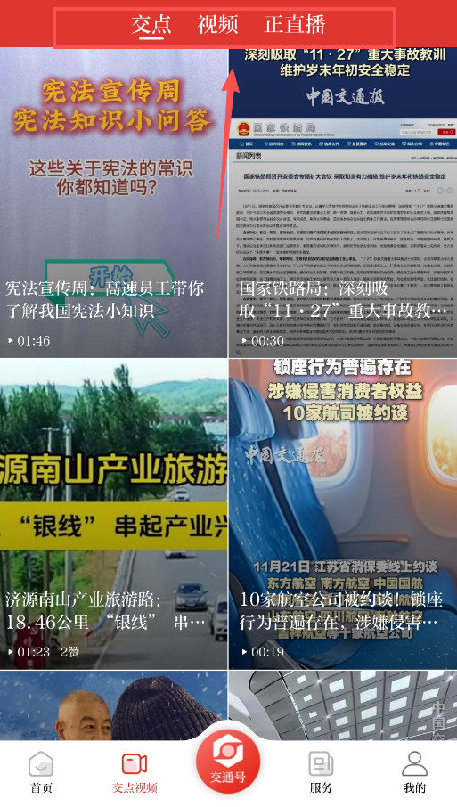 打开软件后,底部设有清晰的导航栏,包含首页、交点视频、交通号、服务和我的这几个选项。