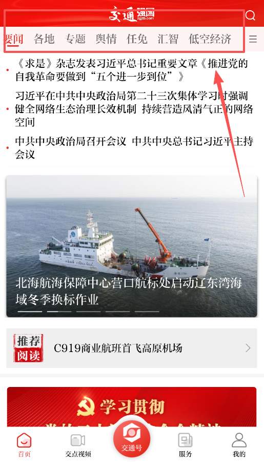 若想浏览新闻与热点视频,可返回“首页”或“交点视频”页面;首页中的“交通强国”板块包含要闻及各类专题内容。