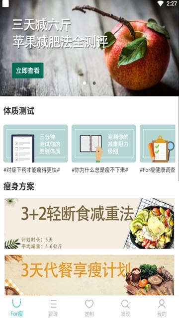 For瘦是一款专为用户打造的减肥辅助应用软件。你可以借助它为自己量身定制科学的减肥计划,还能随时记录身体的各项数据,功能相当全面。通过运动实现减重目标时,数据的变化能让你更直观地感受到成果,从而激发更强的减肥动力,同时也能清晰查看自身各项指标的情况,感兴趣的朋友可别错过啦。