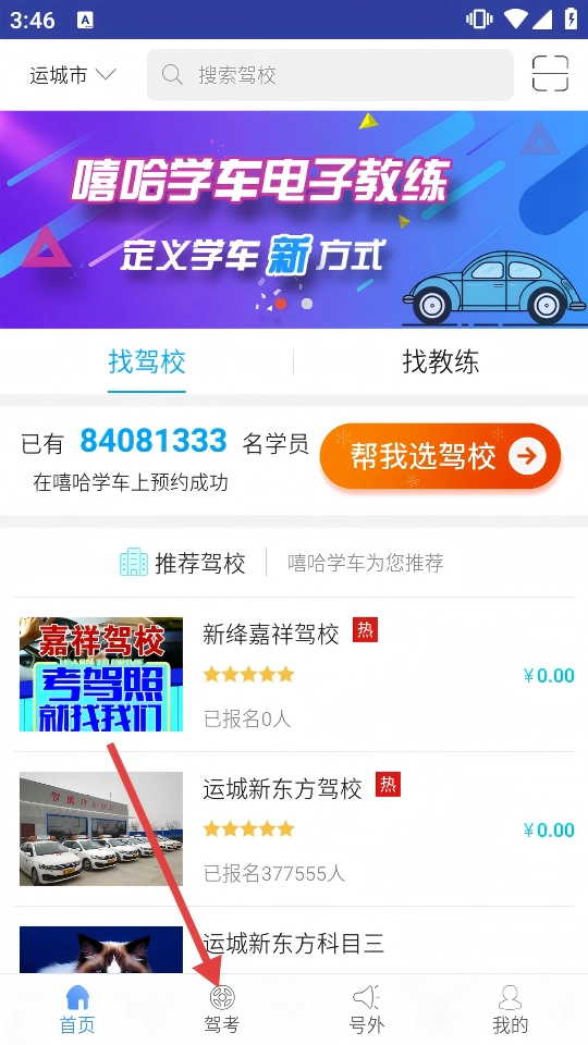 1. 轻点首页底部的【驾考】按钮,就能进入驾考学习页面。